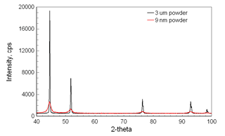 Diffraction patterns for micron and nano-sized nickel powders.