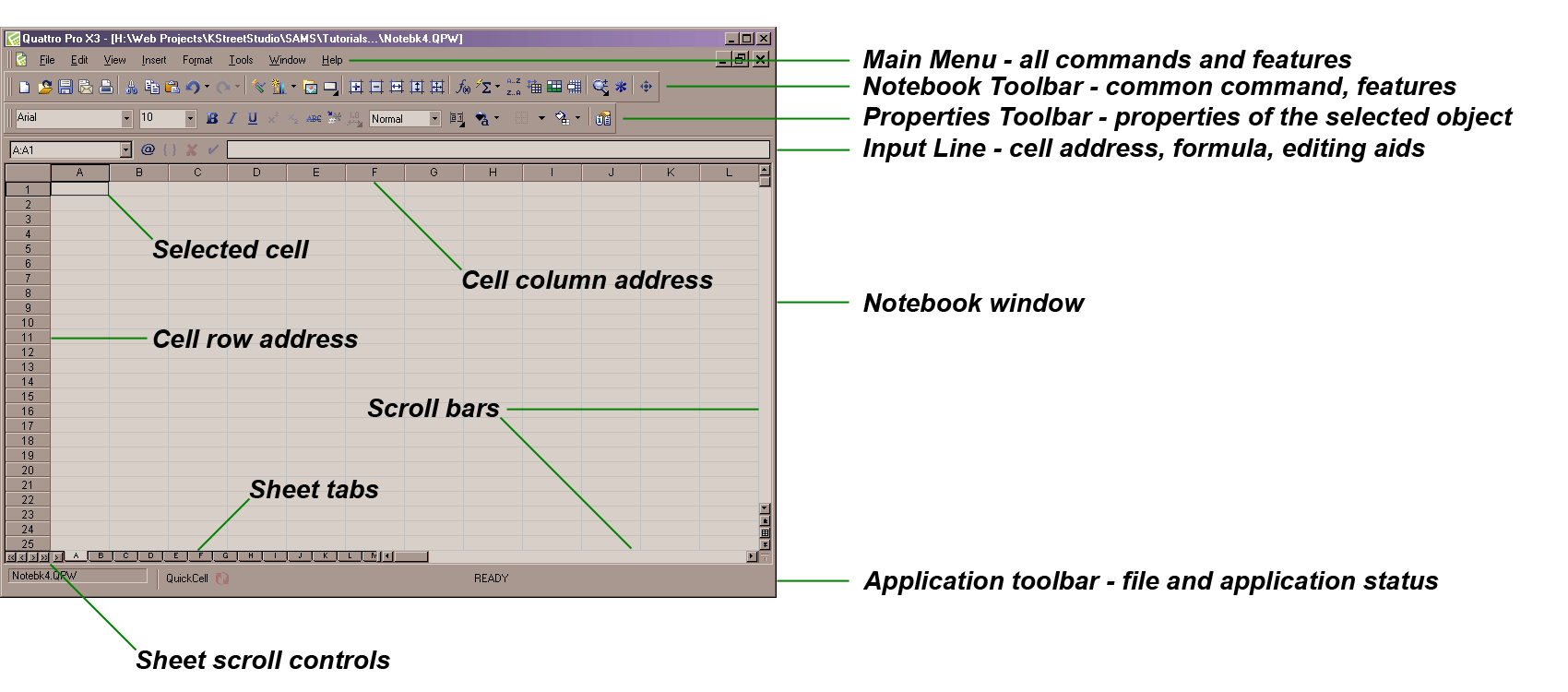 The figure below shows the whole Quattro Pro desktop. At first glance it looks complicated but if ones takes it all in in sections things get easier. For example, along the top of the desktop are the various menus and toolbars that provide quick and easy access to all of Quattro Pro’s functions and features. At the bottom of the screen are the status displays that let you know what Quattro Pro is doing (current file, recalculating) and the current edit and keyboard modes (num lock, caps lock, scroll lock, insert/overwrite). Navigation controls that help you move from sheet to sheet are also located along the bottom of the screen. The large center section contains the cells of the spreadsheet. To summarize - top=menus, bottom=status, middle=workspace.