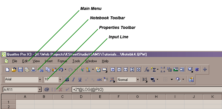 Input Line - The input line provides an easy way to view and edit the contents of a cell. It displays the cell’s address, allows one to insert the name of a named cell, includes buttons to aid in inserting functions and macros and an there is an edit box that displays the formula. The formula can be edited here or in the cell, and in fact, this toolbar indicates that the currently selected cell is A:R11 (sheet A, column R, row 11) and the equation in that cell is +2*@log(@PI/2).