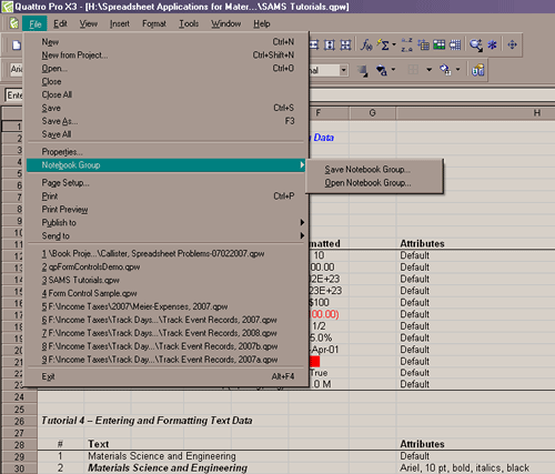 A notebook group is in effect created whenever you have more than one notebook open. But, to get Quattro Pro to recognize these as a group, you simply save it as such by selecting Files|NotebookGroups|Save Notebook Group from the main menu (see the figure below). Likewise, to open these notebooks as a group just select Files|NotebookGroups|Open Notebook Group.
