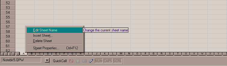 Note that even after renaming your sheets that they still retain their original letter names, and these single letter names will always refer to the order of the sheets, even after moving them. For example, if you rename the third sheet (sheet "C") to something like "Third Sheet", you can reference it in your formulas using both the new name and the letter "C". If you later move this sheet, say, ahead of all others, it retains its new name but the letter name will change to "A". But don't worry, Quattro Pro will automatically change all of your cell references from sheet "C" to "A".