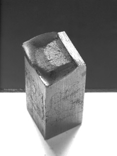 ![]() The fracture surface of this Charpy impact specimen show that the fracture mode was a mixture of ductile (dull gray) and brittle (shiny, salt and peppery appearance). |