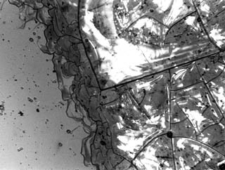 ![]() Superficial fractures caused by stresses resulting from ion substitution. The glass on the left is untreated. |